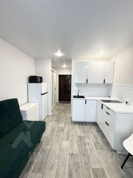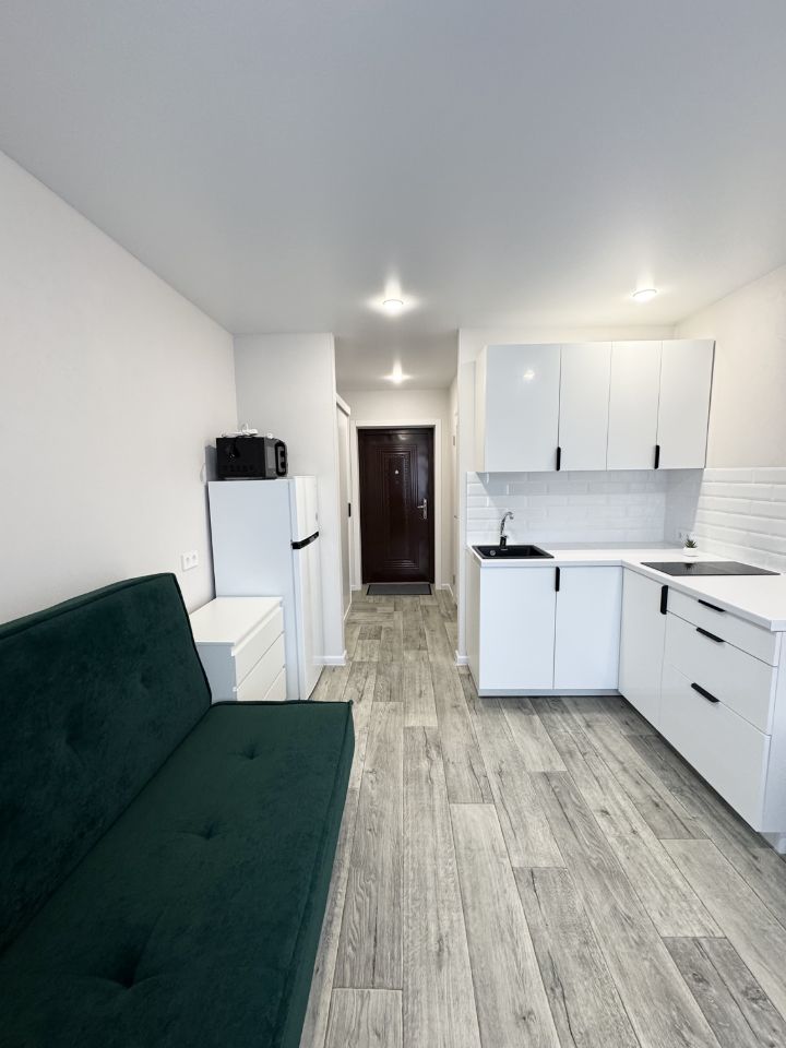 Кухонный гарнитур, встроенная варочная панель (2-комфорочная), холодильник, микроволновая печь.