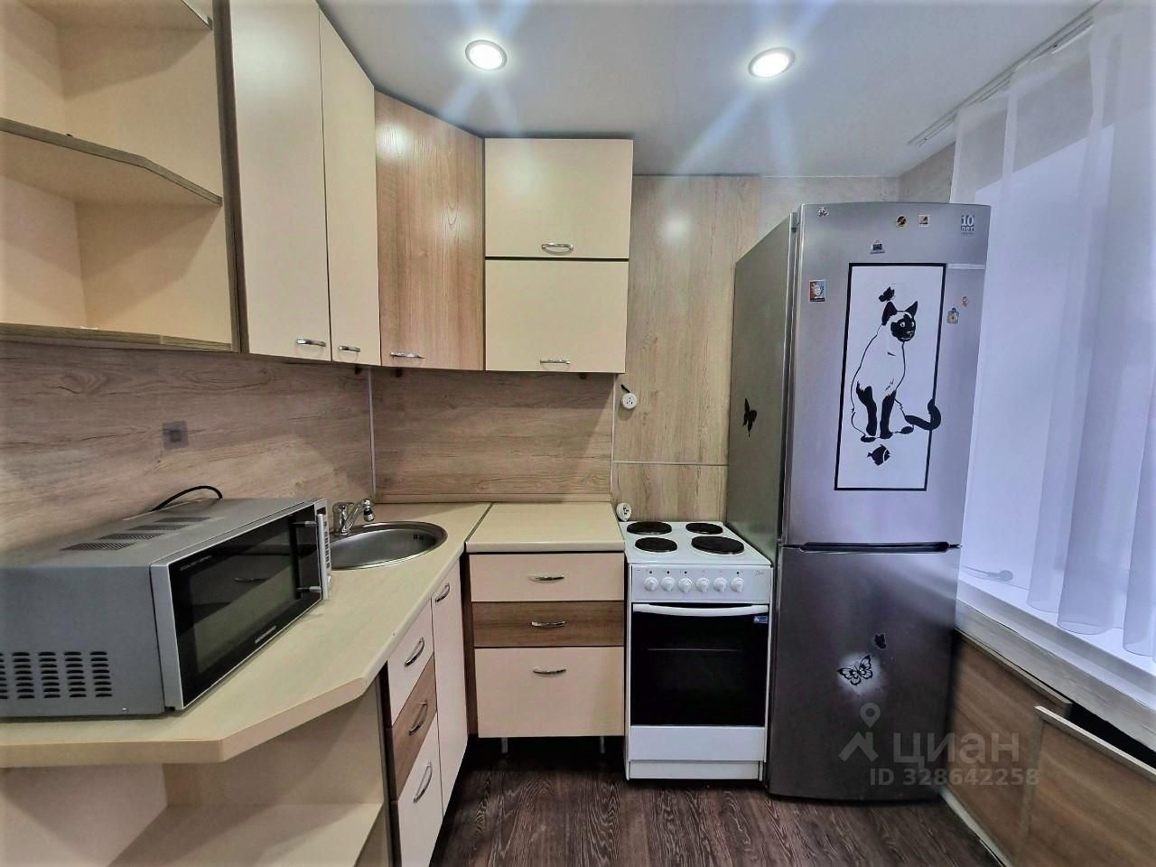 Квартира укомплектована мебелью и техникой: диван, шкаф встроен, письменный стол, прихожая, зеркало, кух. гарнитур, электроплита, микроволновая печь, холодильник, стиральная машинка, обеденная группа (стол+табуретки). Санузел совмещен.
