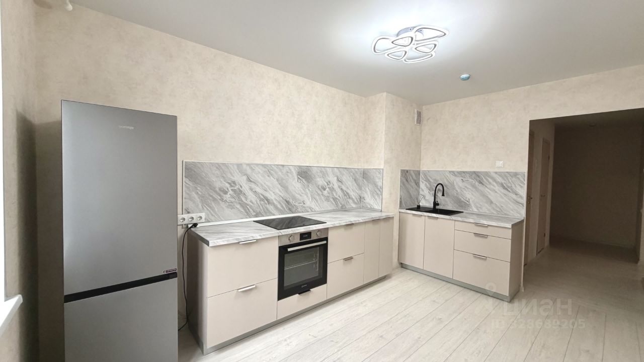 В квартире имеется: кухонный гарнитур, холодильник, варочная панель, духовой шкаф, стиральная машинка. Из окна вид на детскую площадку.