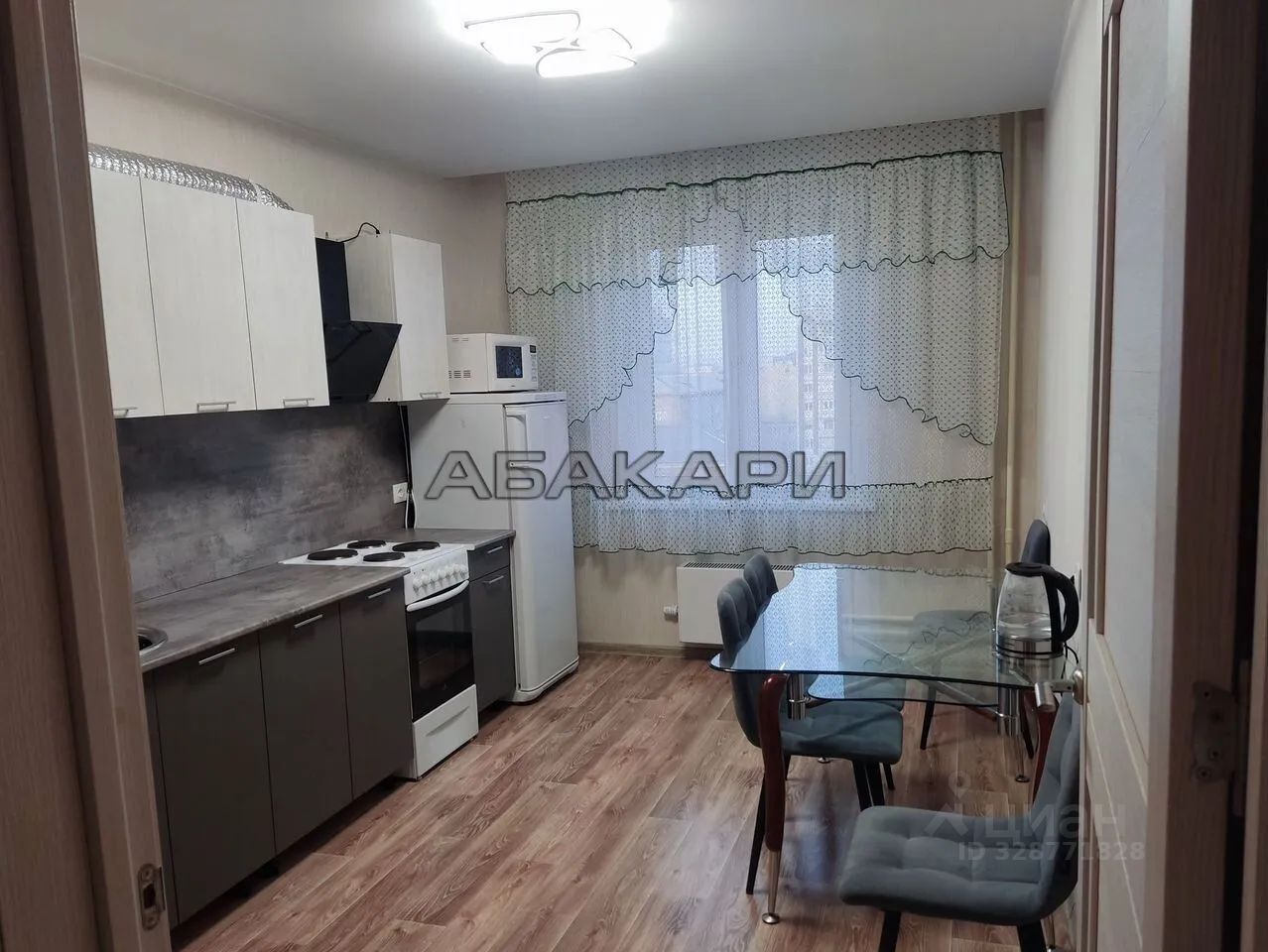Полностью укомплектованная кухня (гарнитур, плита, холодильник, микроволновка, чайник, вытяжка, стол, стулья).
