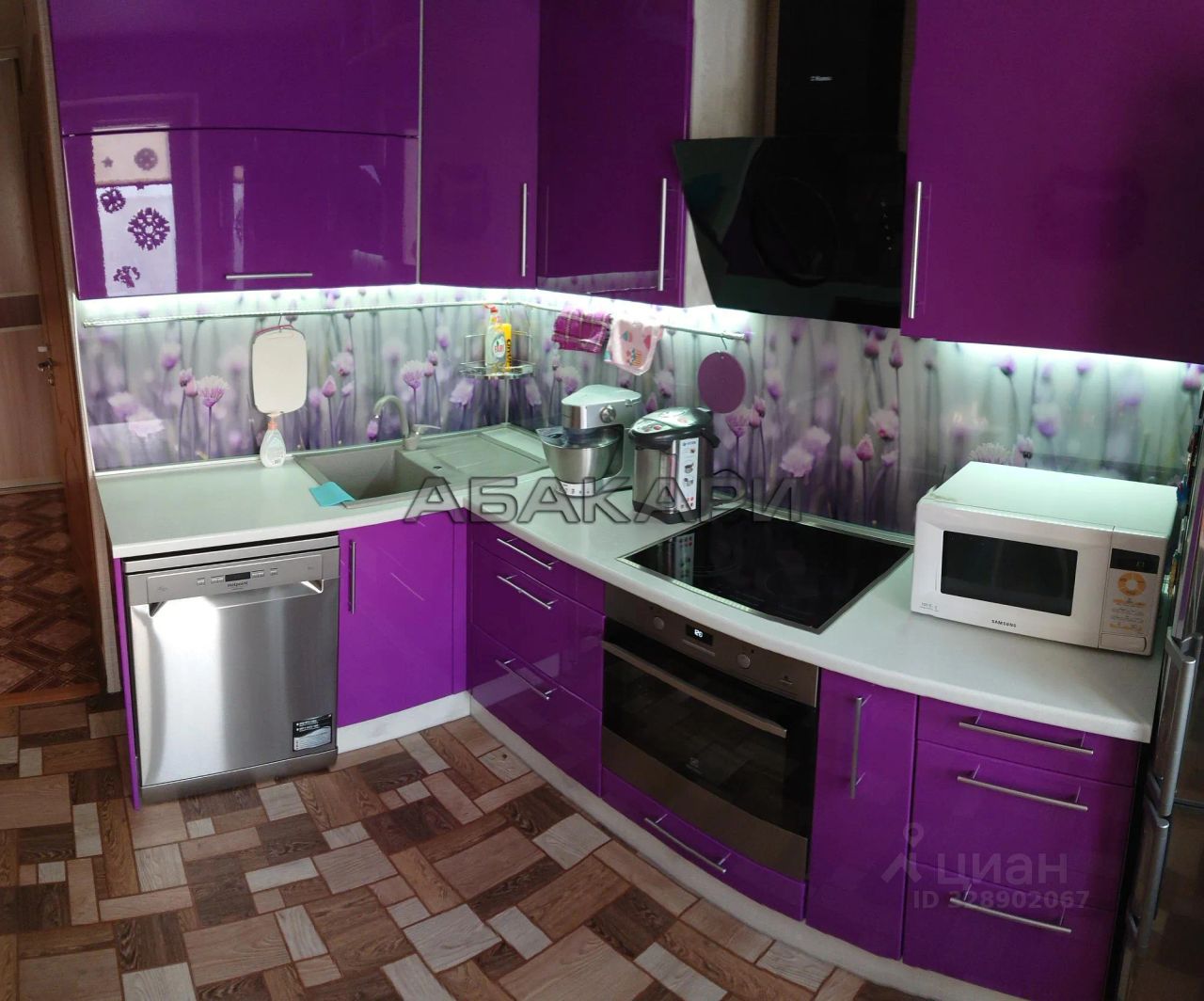 На кухне есть холодильник, духовой шкаф, варочная панель, вытяжка, посудомойка, микроволновка, чайник, тв, стол и стулья.
