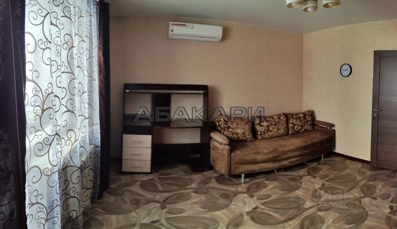 В гостиной диван, стол для компьютера, небольшая стенка с ТВ, есть кондиционер.