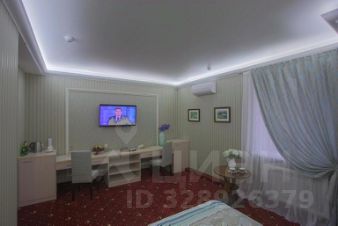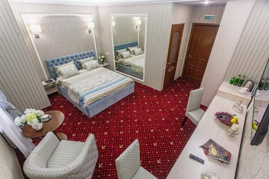 Номер Полулюкс с двуспальной кроватью 27 кв.м. В номере: кондиционер, телевизор с плоским экраном и спутниковыми каналами, холодильник, чайник, душ, халат,тапочки,фен и письменный стол.