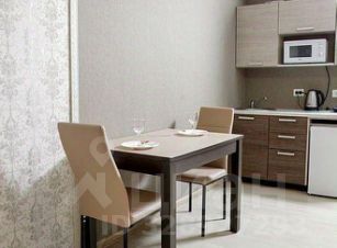 В апартаментах установлена современная индукционная плита, мини-холодильник, микроволновка, все необходимые посудные принадлежности, в этой квартире также очень уютная обеденная зона с двумя мягкими стульями и красивым кухонным столом.