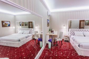 Номер Делюкс с двуспальной кроватью 30 кв.м. В номере: кондиционер, телевизор с плоским экраном и спутниковыми каналами, холодильник, чайник, душ, халат,тапочки,фен и письменный стол.