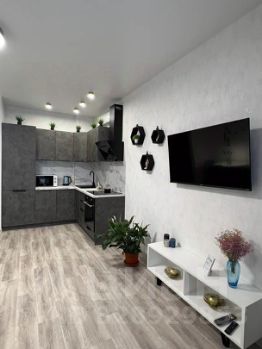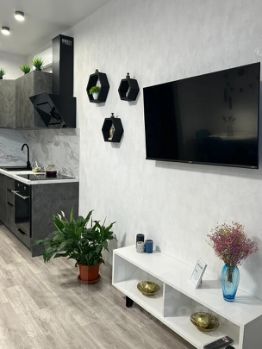 Студия оборудована всем необходимым для комфортного проживания: диван ортопедический, Wi-Fi и Smart-TV, телевизор 50 дюймов, кухня с плитой, духовым шкафом, микроволновкой, холодильником, чайником и кофеваркой, вся необходимая новая посуда для готовки и приема пищи, бокалы, стиральная машина, все для стирки и глажки, белоснежное постельное белье, фен, аптечка.
