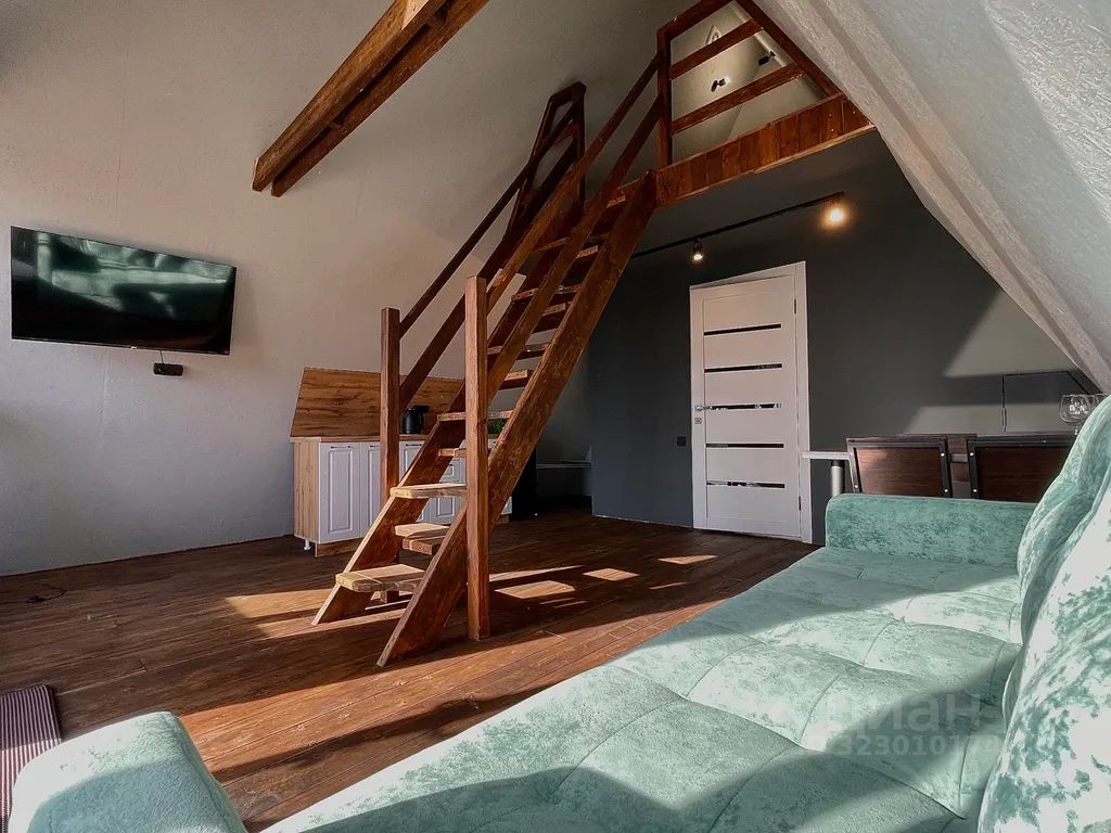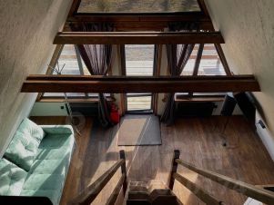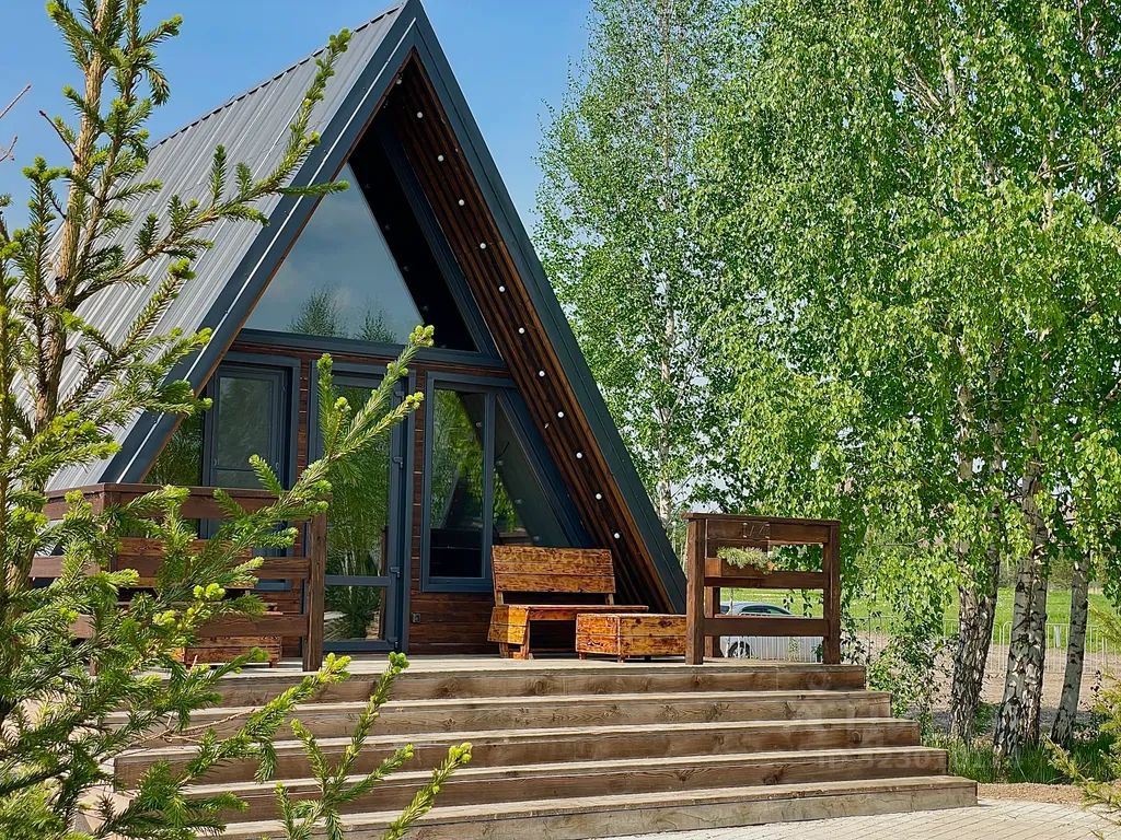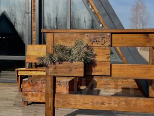 Комфортный 4-х местный треугольный дом А-фрейм с собственной террасой с деревянной мебелью. Размер дома 46 м2, на первом этаже:
