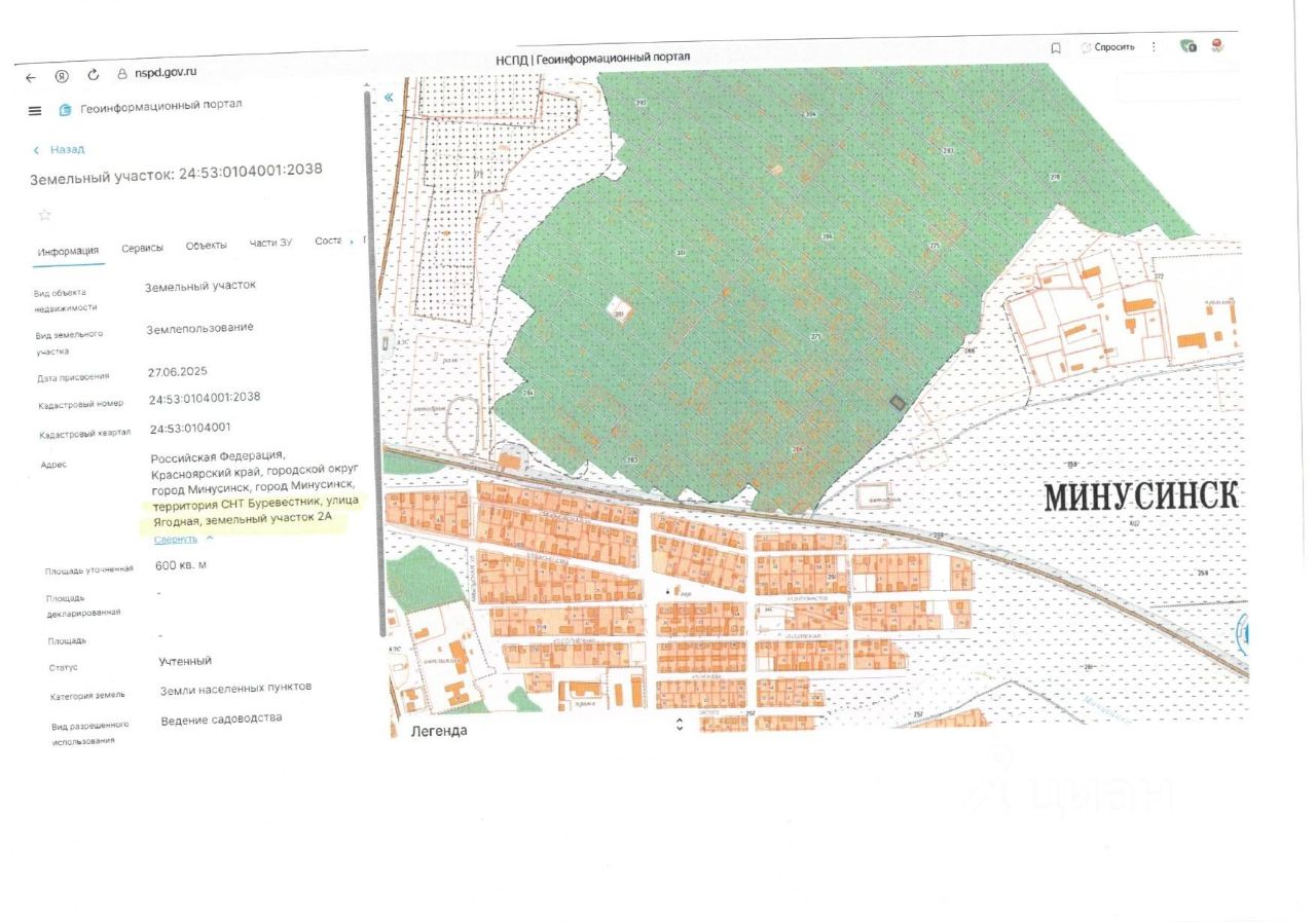 Земельный участок с кадастровым номером 24:53:0104001:2038, площадью 600 кв.м, по адресу: Российская Федерация, Красноярский край, городской округ город Минусинск, город Минусинск, территория СНТ Буревестник, улица Ягодная, земельный участок 2А, категория земель земли населенных пунктов, с разрешенным использованием ведение садоводства.