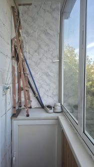 ~Балкон обшит вагонкой и застеклен.