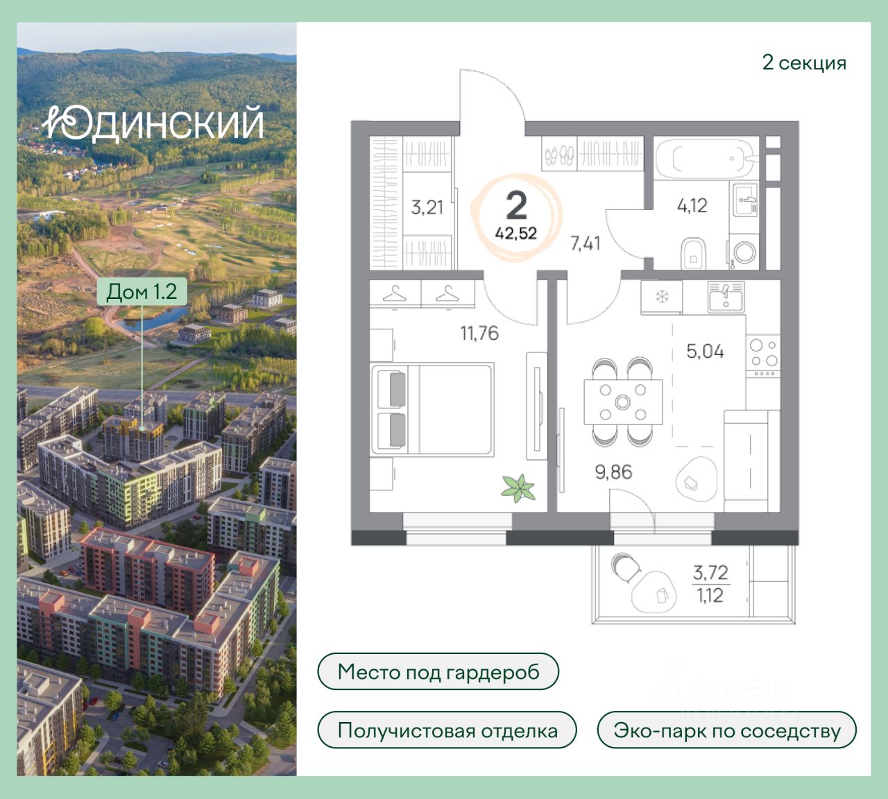 2-комнатная квартира, 42.52кв.м., 5 этаж