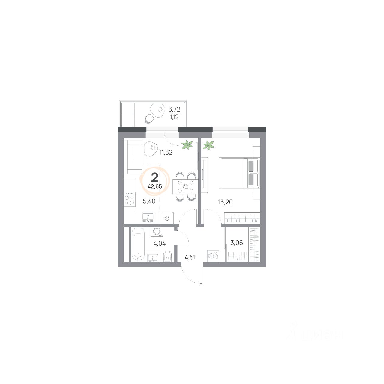 2-комнатная квартира, 42.65кв.м., 8 этаж
