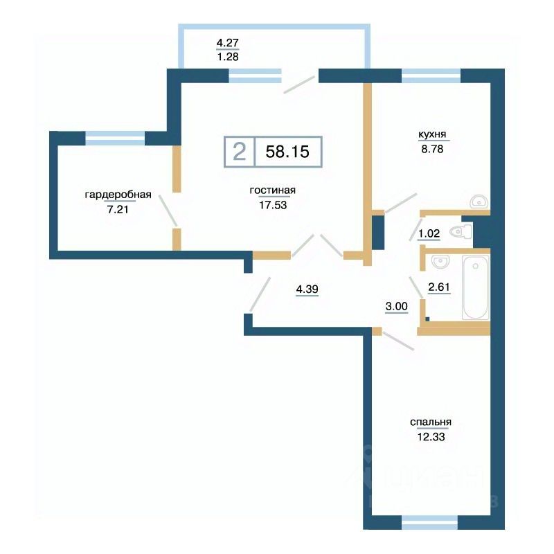 Общая площадь58,15 м²