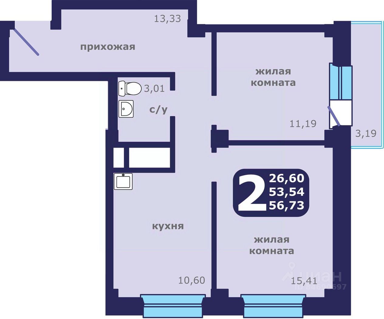 Общая площадь56,73 м²
