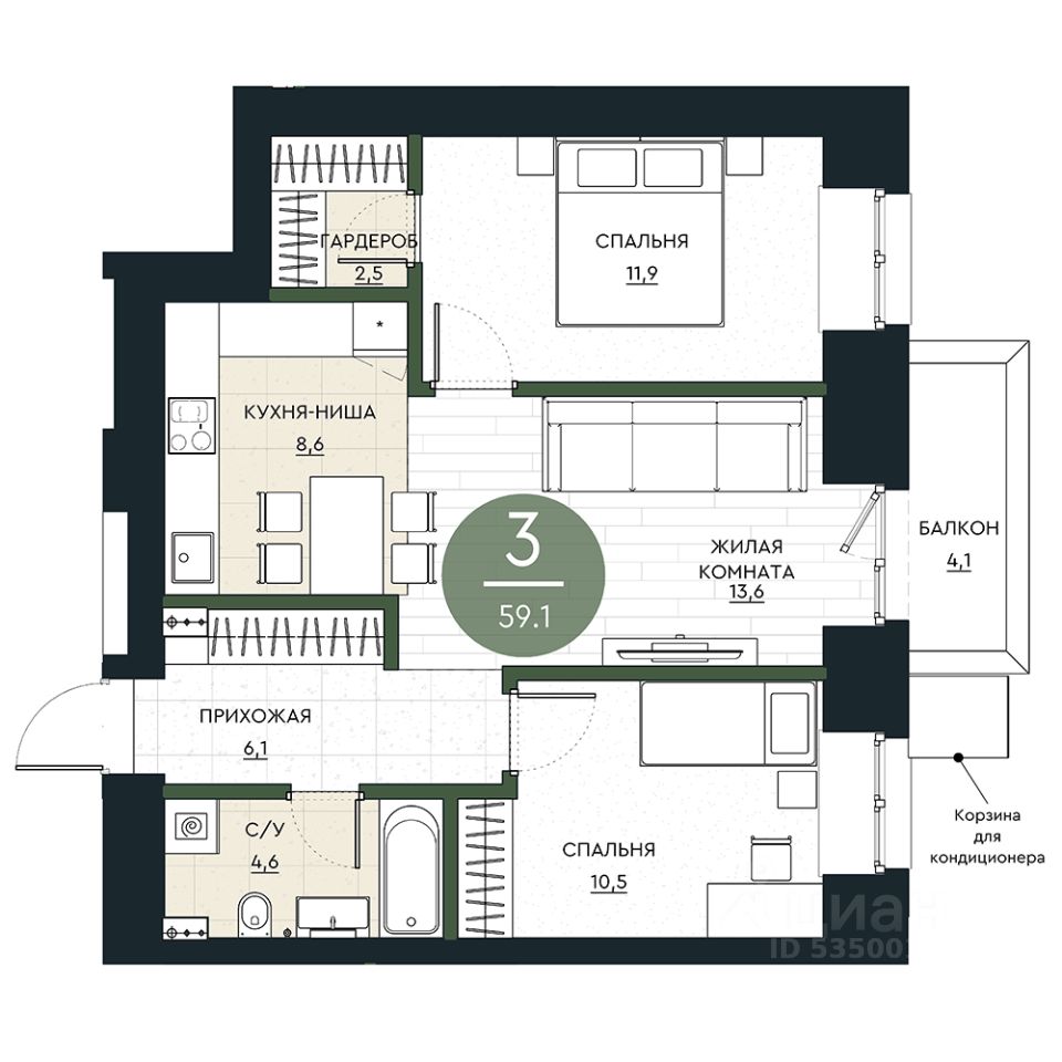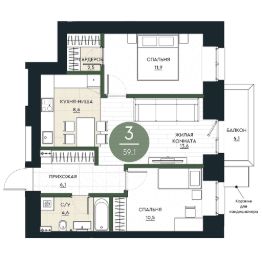 Продаётся 3-комнатная квартира в строящемся доме (Секция 3), срок сдачи: IV-кв. 2026, общей площадью 59.1 кв.м., на 13 этаже. Калина Долина - продолжение нового формата городской жизни - "зеленых районов" от АРБАН. Впервые мы вписываем жилой комплекс в сложный природный ландшафт с перепадом высоты до 10 м и настоящей рекой.