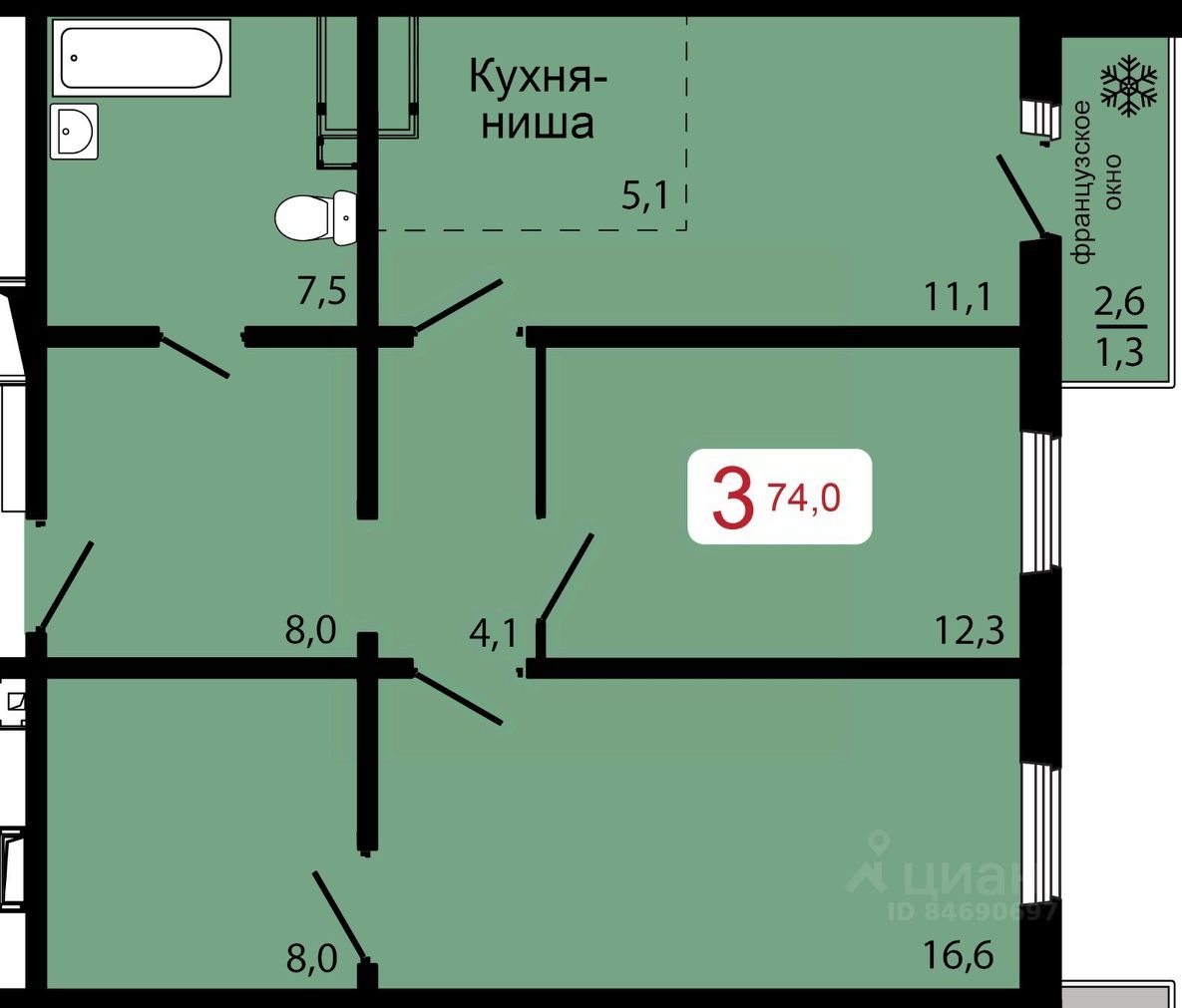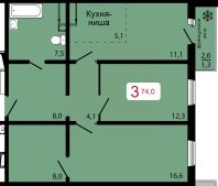 Продаётся 3-комнатная квартира в строящемся доме (Дом 1), срок сдачи: IV-кв. 2026, общей площадью 74 кв.м., на 12 этаже.