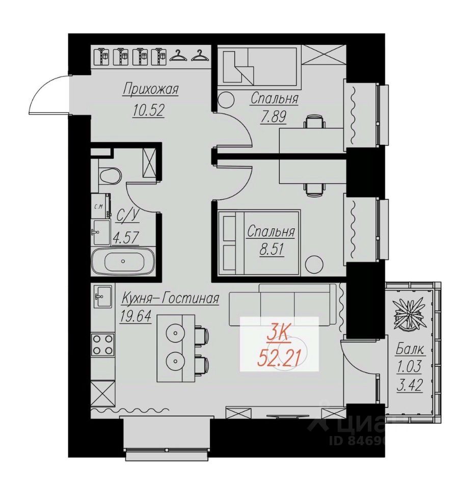 Продаётся 3-комнатная квартира в строящемся доме (Дом 2 Корпус 2), срок сдачи: I-кв. 2026, общей площадью 52.21 кв.м., на 15 этаже.