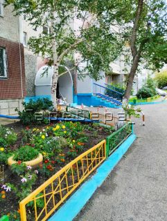 Благоустроенный открытый двор, на территории, которого детская площадка, зона парковки, много деревьев и зеленых насаждений.