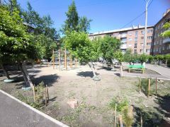 Закрытый за шлагбаумом двор , с детской и цветочной площадками.