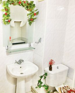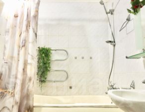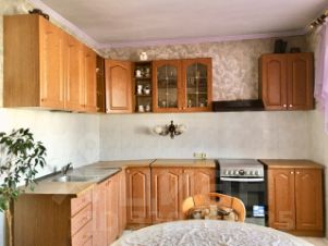 Стены и потолки в квартире ровные, потолки украшены лепниной. На полу всех помещений ламинат и кафель. Кухня и санузел выложены кафельной плиткой.