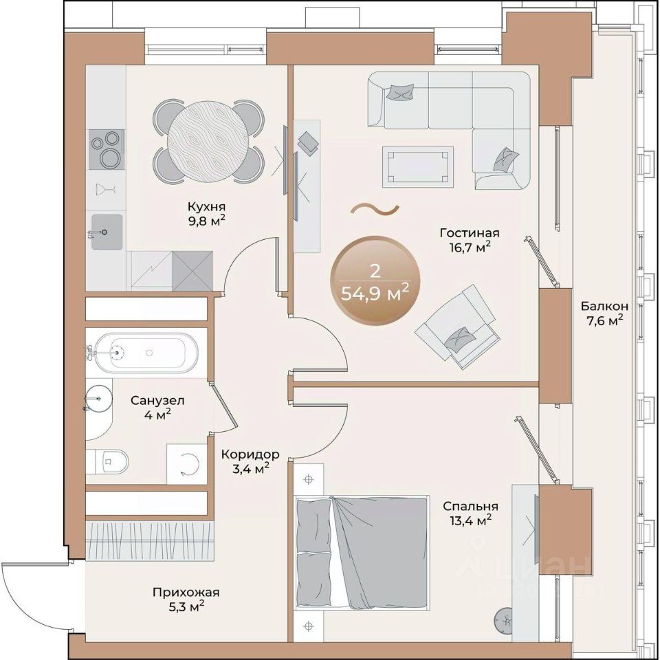 Общая площадь54,9 м²