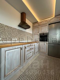Кухонный гарнитур из массива со встроенной техникой Воsсh: духовой шкаф, варочная поверхность, холодильник, посудомоечная машина, вытяжка. Раковина расположена в подоконнике с видом на западную сторону во двор. Смесители Grоhе.