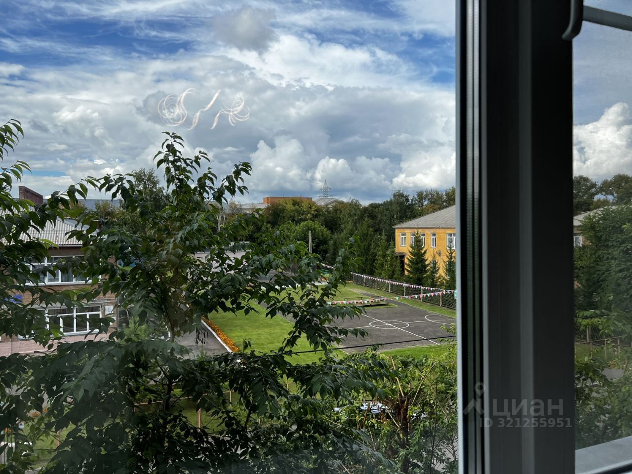 Планировка на две стороны: в большой комнате застеклённый балкон с видом на двор, на кухне и в другой комнате окна выходят на детский сад.