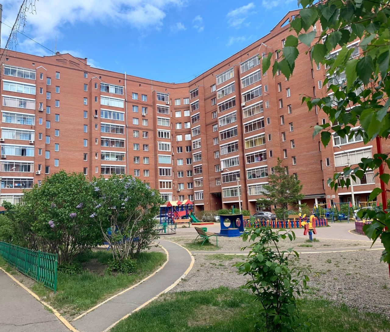 -Благоустроенный двор - оборудованы детские и спортивные площадки, рядом школьный стадион.
