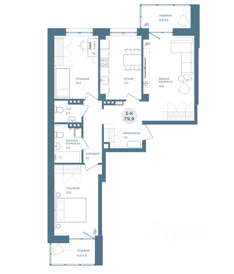 Продаётся 3-комнатная квартира в сданном доме (Дом 1-1), срок сдачи: III-кв. 2025, общей площадью 76.3 кв.м., на 1 этаже.