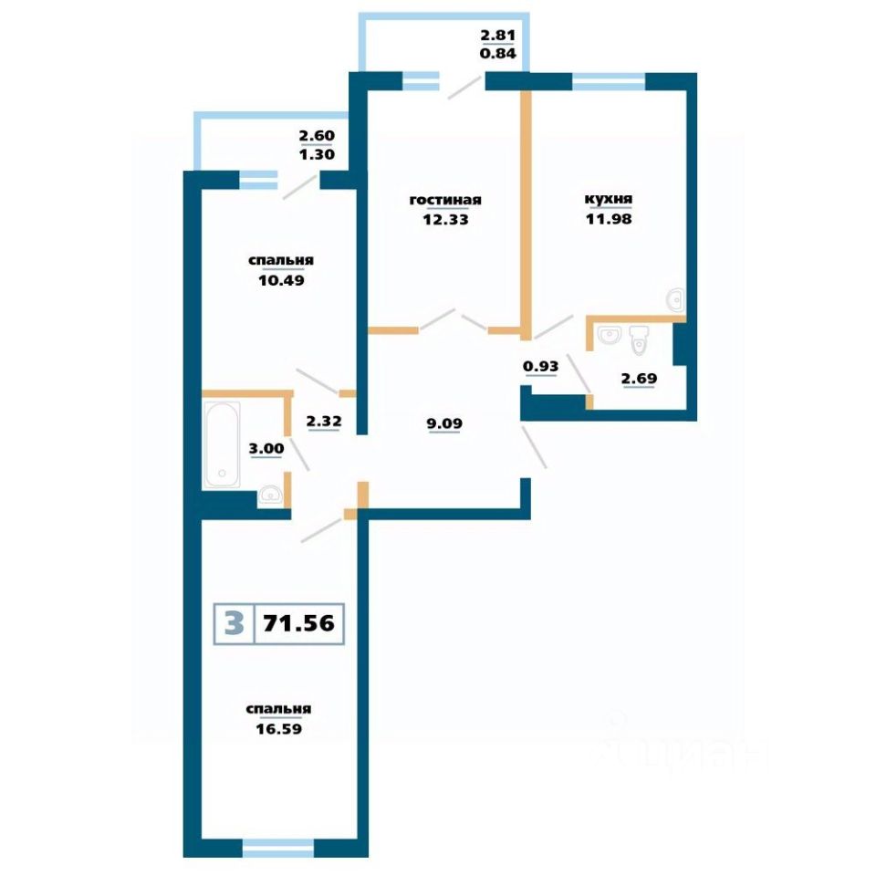 Продаётся 3-комнатная квартира в строящемся доме (Дом 12), срок сдачи: IV-кв. 2027, общей площадью 71.56 кв.м., на 14 этаже. Расположение, транспортная доступность