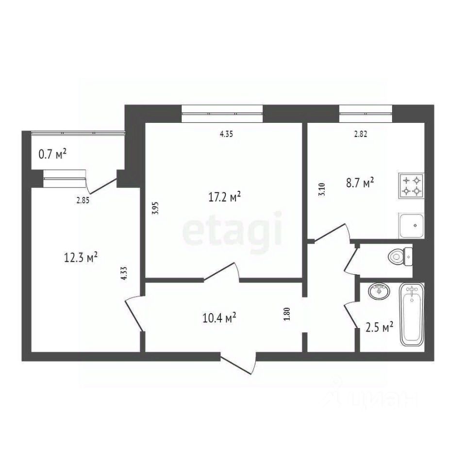 — Зал 18 м² и вторая комната 12 м² — можно обустроить под любые нужды: гостиную, спальню, кабинет или детскую.