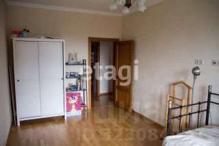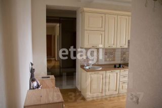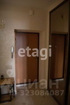 В коридоре встроенный шкаф-купе огромный в два уровня (слоя), потолок в коридоре натяжной, на полу кафель.