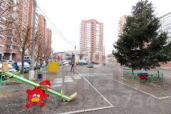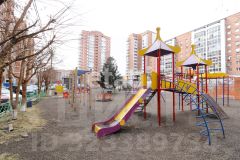 Обустроенный зеленый двор с детской площадкой и подземной парковкой.