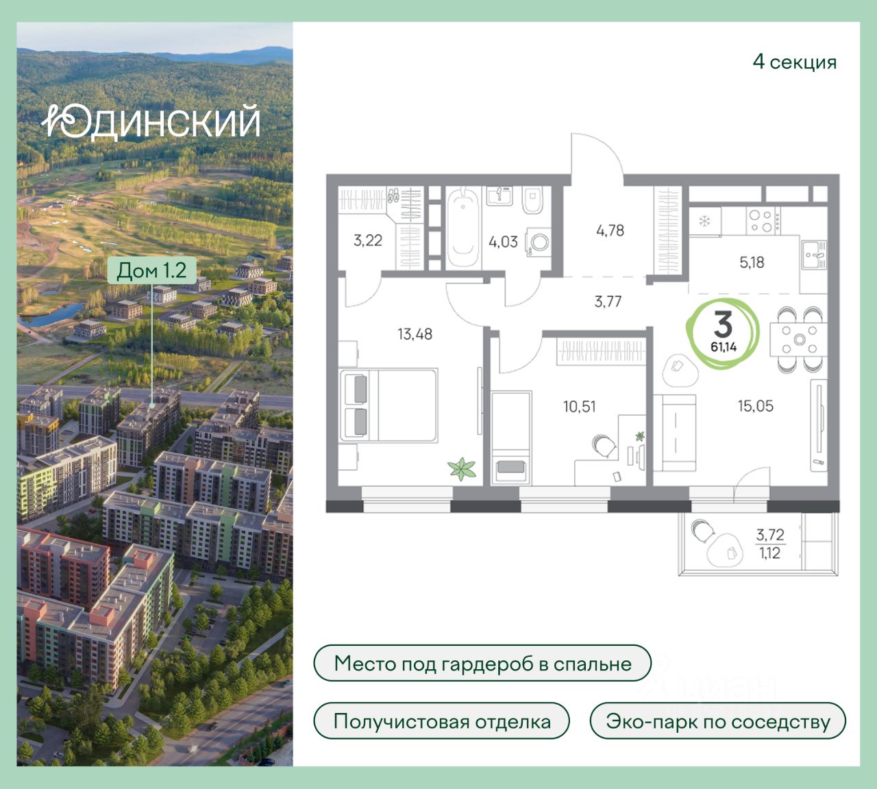 3-комнатная квартира, 61.14кв.м., 2 этаж