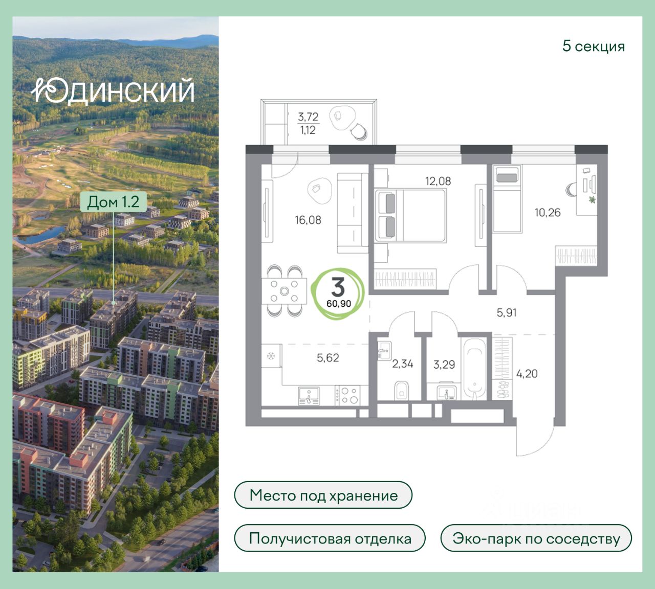 3-комнатная квартира, 60.9кв.м., 2 этаж