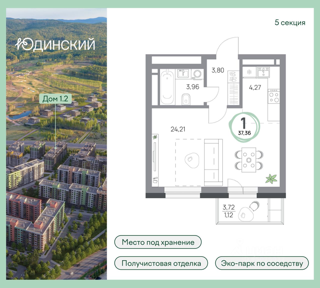 1-комнатная квартира, 37.36кв.м., 8 этаж