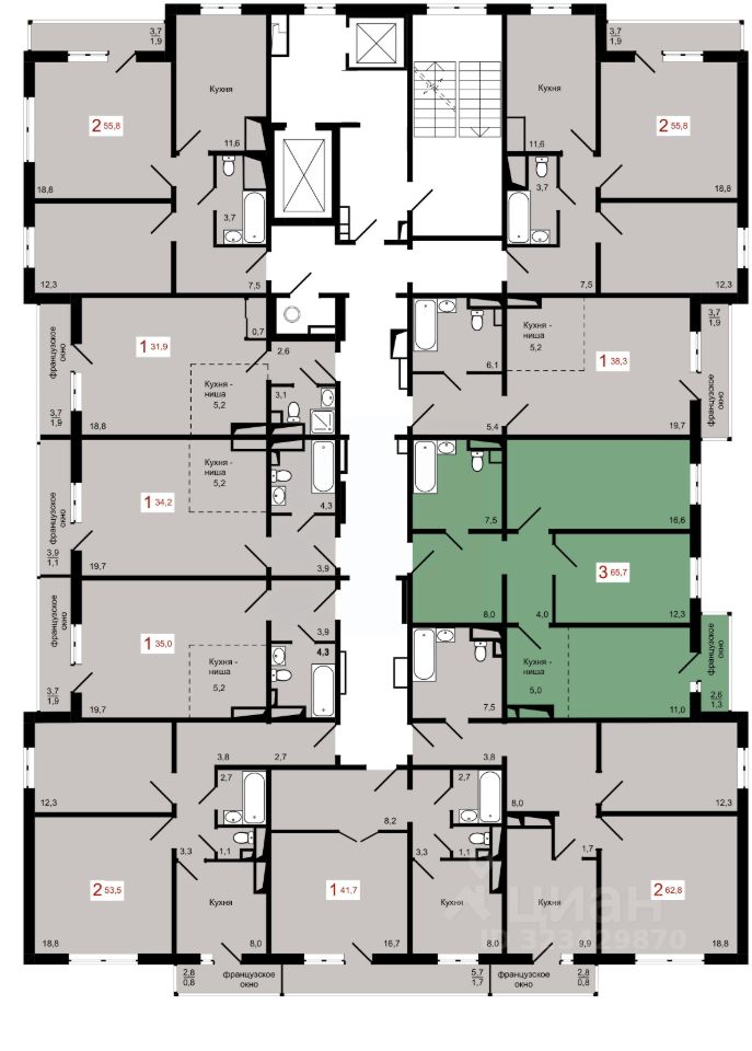 Продаётся 3-комнатная квартира в строящемся доме (Дом 7 строение 1), срок сдачи: IV-кв. 2027, общей площадью 65.7 кв.м., на 6 этаже.