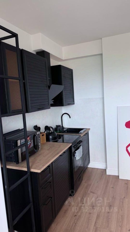Кухня: черный гарнитур, вытяжка, электро-плита, холодильник, стол и 4 стула. Кухня просторная, с диодным освещением по кирпичной стене.