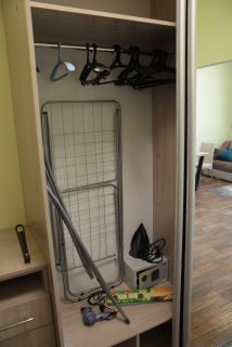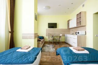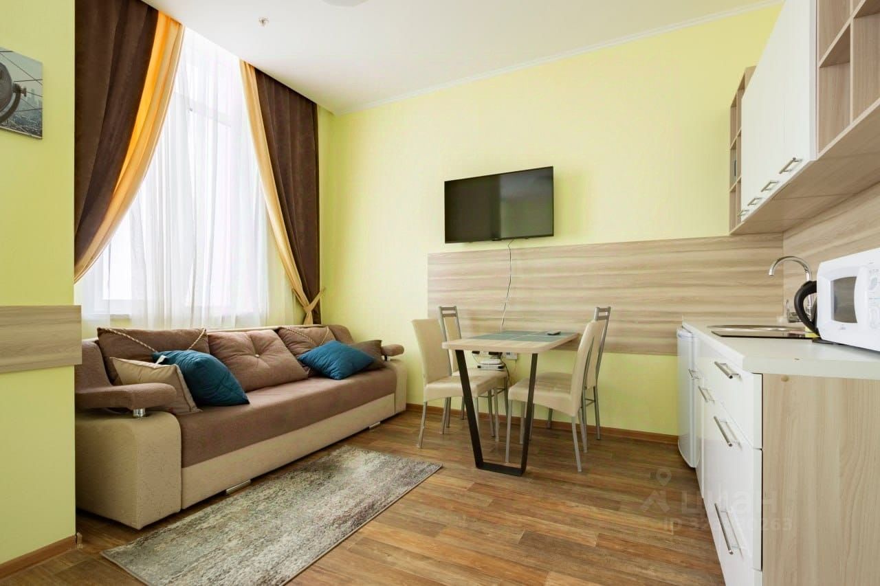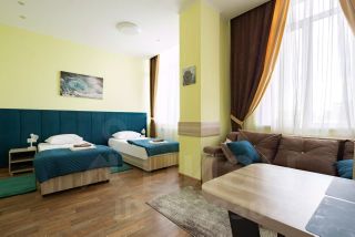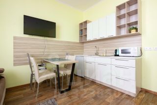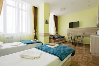 Номер оснащен всей необходимой для проживания мебелью и техникой: кровать - может быть как двуспальной так и семейной, ортопедические матрасы- выдерживают до 150 кг, прикроватные тумбы, наматрасники, запасные одеяла, подушки, диван, кухонный гарнитур, стол, стулья, телевизор, плита, чайник, микроволновая печь, стиральная машина, встроенный шкаф, а также постельное белье, посуда, полотенца, халаты, коврики -всё, чтобы вы сразу смогли сдать апартаменты в аренду или заселиться и жить с комфортом.