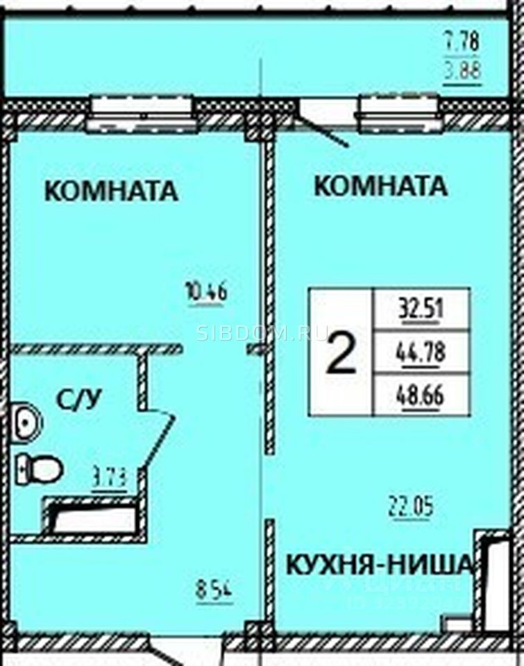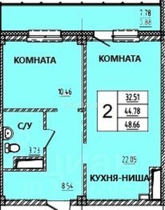 Общая площадь квартиры — 48,79 кв.м., жилая 10,46кв.м., кухня 22,06 кв.м.