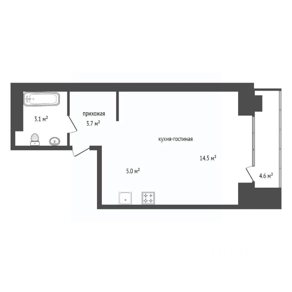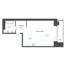 - Большая комната, позволяет сделать зонирование и отделить кухню;