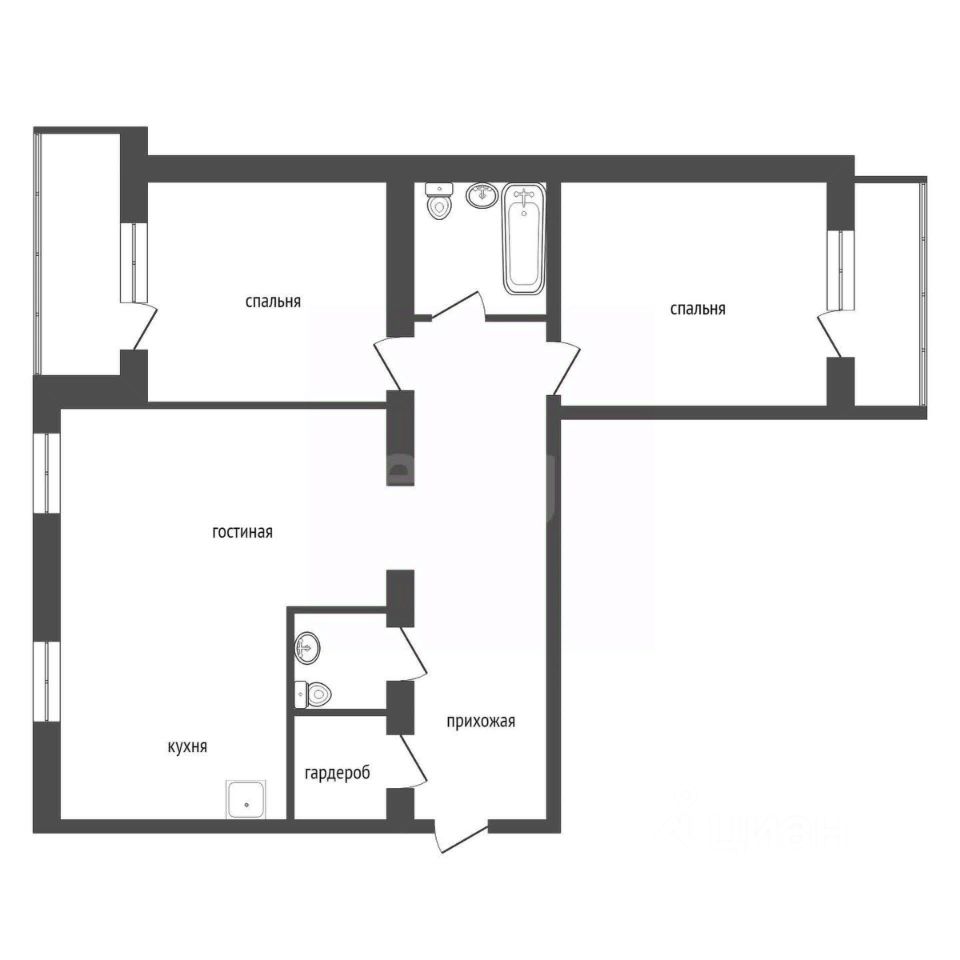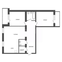 Черновая отделка. Изолированные комнаты и объединенная кухня-гостиная 35 м².