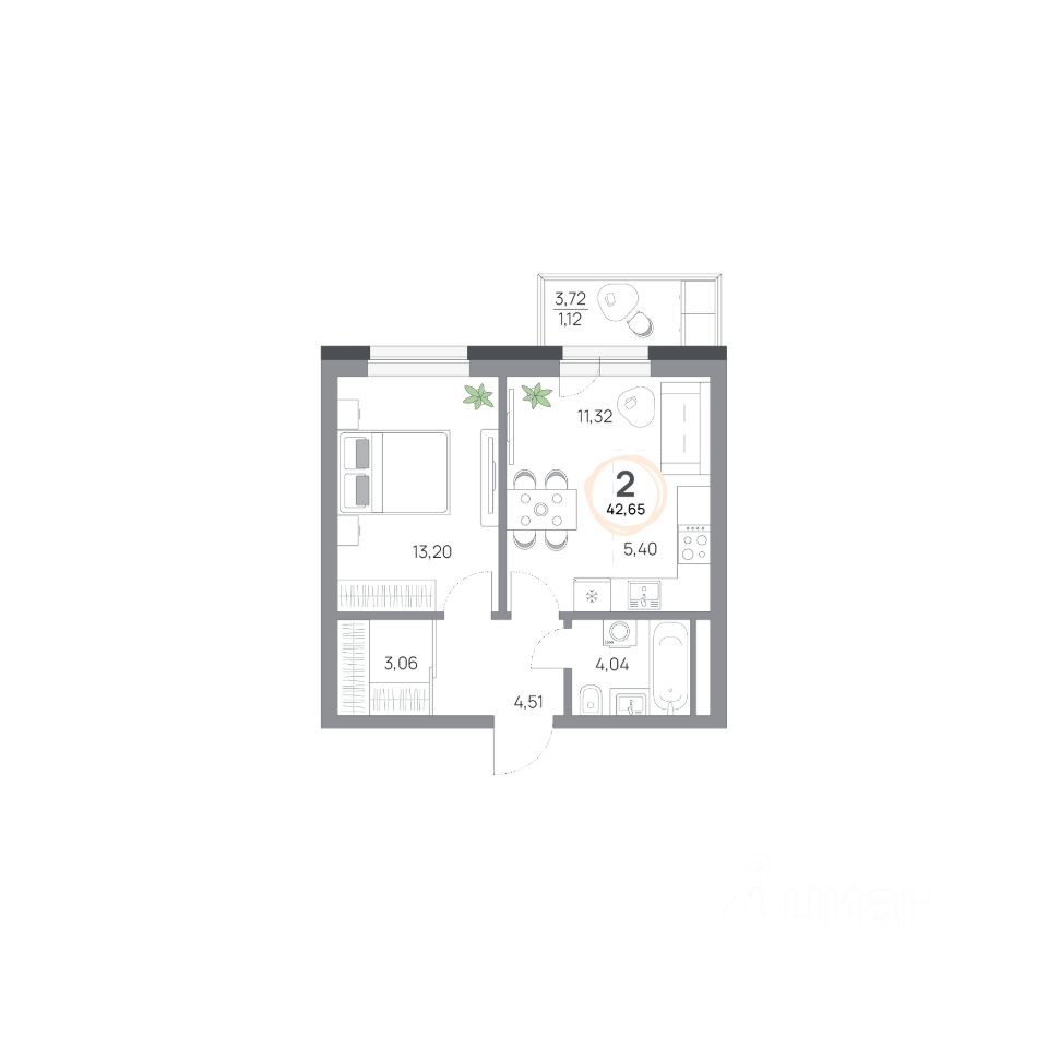 2-комнатная квартира, 42.65кв.м., 5 этаж