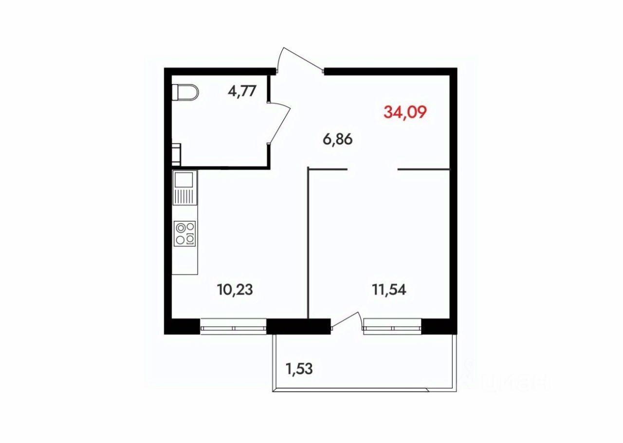 Общая площадь34,09 м²