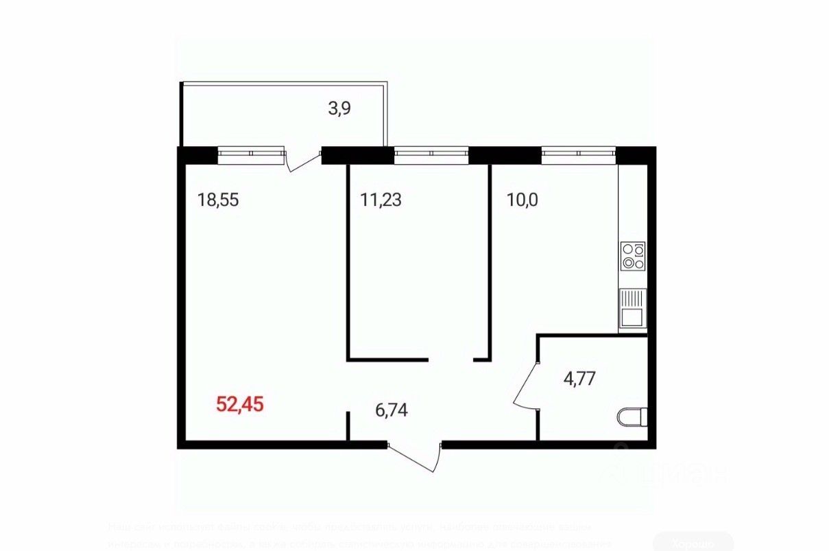 Общая площадь52,45 м²