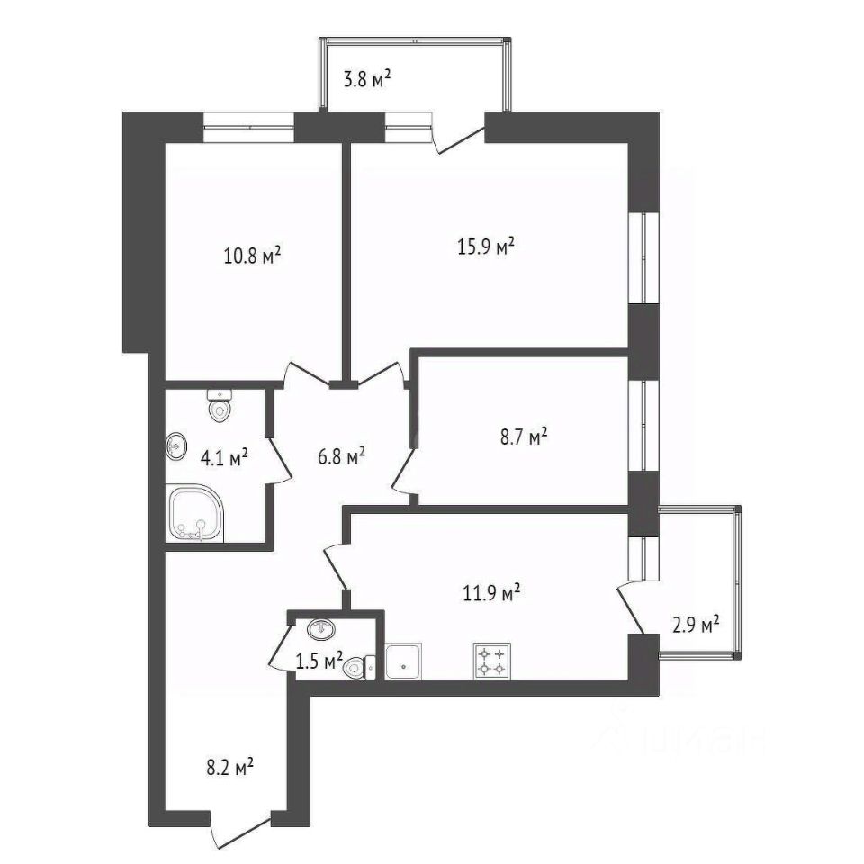 3 комнаты, 68 м²