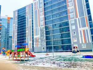 Придомовая территория оборудована парковочными местами, детской и спортивной площадками.