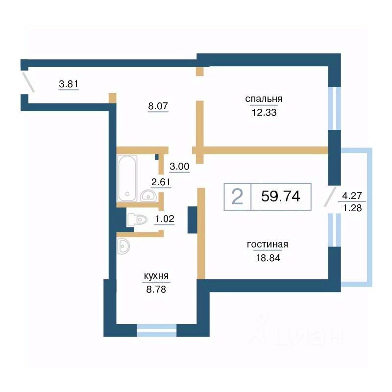 Общая площадь59,74 м²