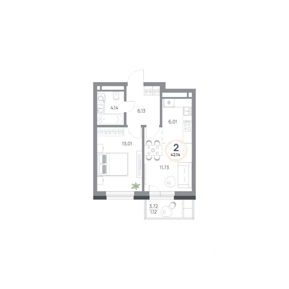 2-комн. квартира, 42,14 м²