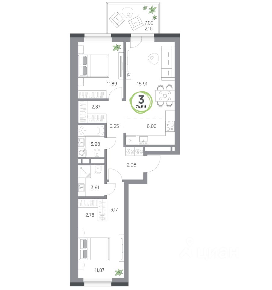 3-комн. квартира, 74,69 м²