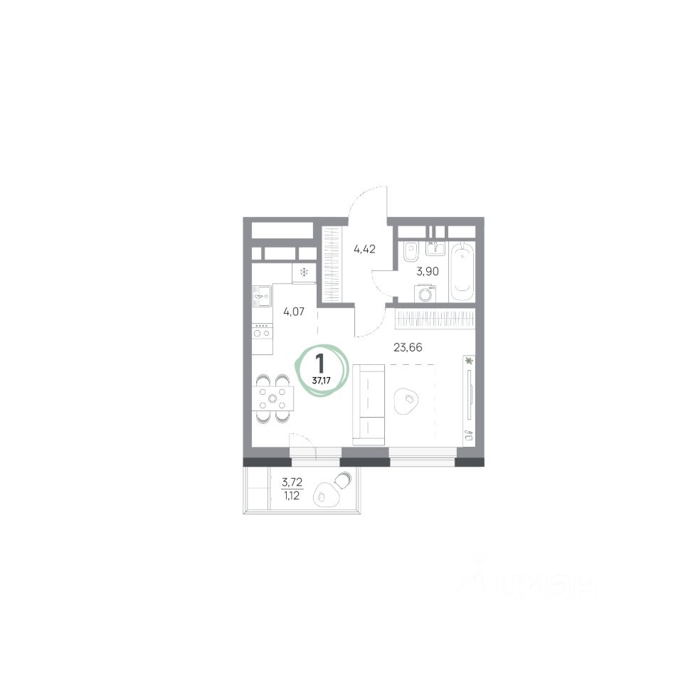 1-комн. квартира, 37,17 м²
